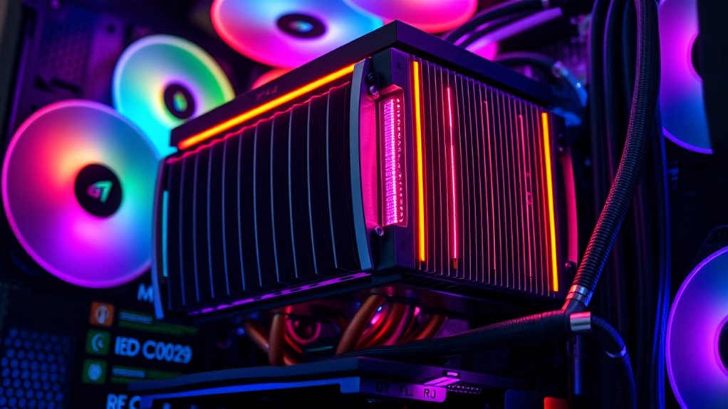 When choosing a premium CPU cooler for overclocking, size and compatibility are key factors that can make or break your setup. First, verify the cooler fits within your case’s available space, considering height, width, and clearance for RAM and PCIe slots. Check your motherboard’s socket compatibility—whether LGA, AM4, or AM5—to avoid installation issues. It’s also important to confirm that the cooler’s mounting system aligns with your motherboard’s mounting holes and backplate. Additionally, consider the overall footprint to prevent obstructing other components or airflow paths. Finally, confirm that the cooler’s maximum height fits within your case’s specifications to avoid clearance problems. Proper sizing and compatibility ensure your overclocking build remains efficient and safe.