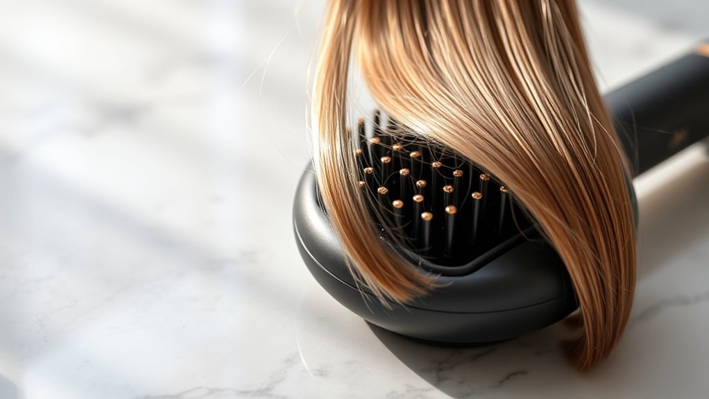 Premium straightening brushes minimize heat damage by using advanced technology like ceramic or tourmaline plates that distribute heat evenly. I love how they often have adjustable temperature settings, so I can choose the lowest effective heat. Plus, some brushes feature sensors that monitor hair temperature, preventing overheating. This way, I achieve sleek, frizz-free hair without risking unnecessary damage, making my styling safer and more efficient.