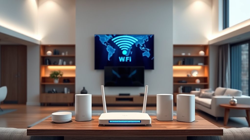 Premium mesh Wi-Fi systems typically include robust security features like WPA3 encryption, automatic firmware updates, and advanced firewalls. I love how these systems also offer device management tools, VPN support, and guest network options to keep my network secure and flexible. These features help prevent unauthorized access and guarantee my connection stays safe, giving me peace of mind knowing my home network is well-protected against potential threats.
