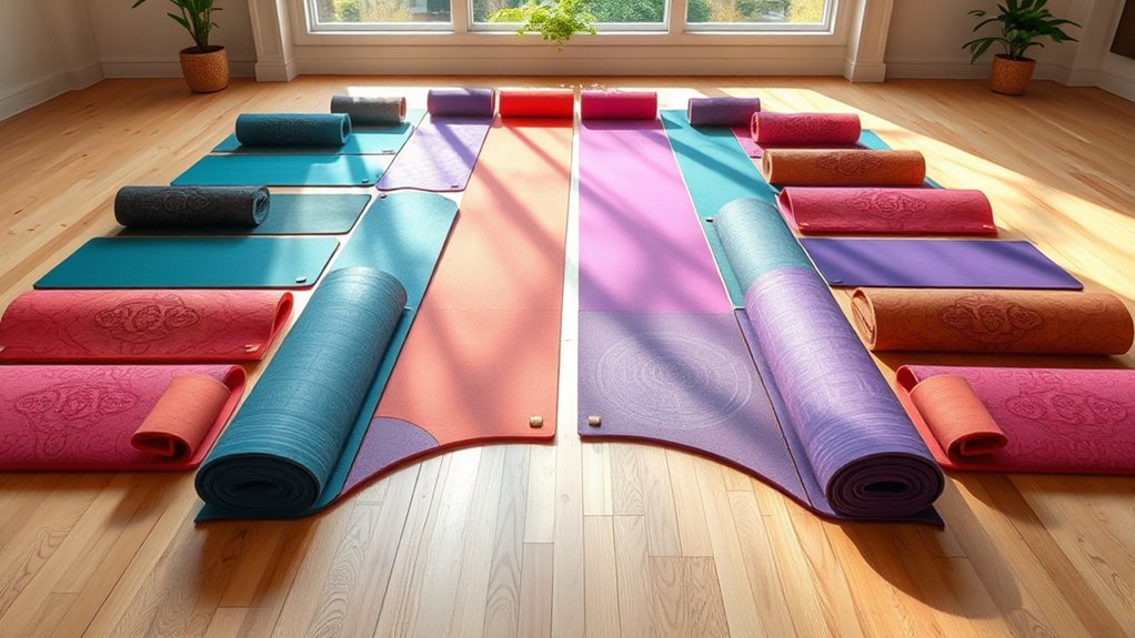Think of textures like the terrain beneath your feet—some are smooth, offering glide, while others are rugged, providing grip. Different textures directly impact your joint stability by either anchoring you securely or allowing slight shifts. I’ve found that a textured surface with a bit of grip helps prevent slipping, giving my joints the support they need to stay steady. Choosing the right texture truly elevates your practice and protects your joints.