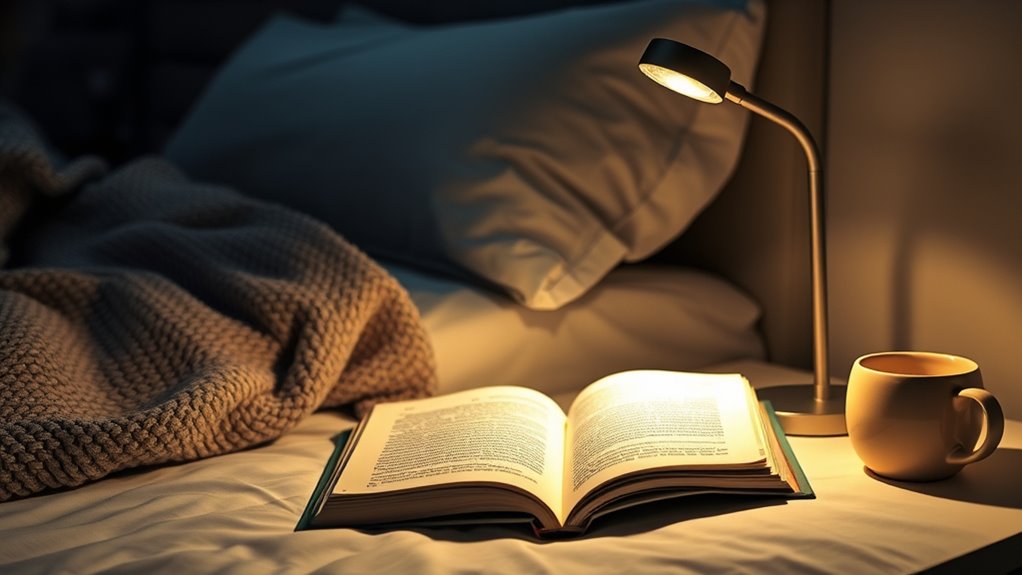 Adjustable positioning is essential for creating a comfortable reading setup in bed, as it allows you to direct light exactly where you need it. With flexible goosenecks or swiveling heads, I can easily change the angle of the light to suit different book sizes and my preferences. Clamps, clips, and mounts with adjustable joints give me versatile options to attach the light to various surfaces or objects around my bed. Being able to modify the height and direction helps me avoid unwanted shadows and glare, making reading more comfortable. Plus, easy adjustment features mean I can quickly reposition the light without disrupting my cozy reading environment. This flexibility ensures I get perfect illumination every time, enhancing my overall reading experience at night.