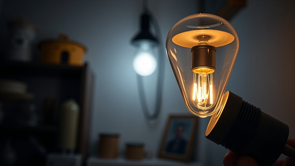 Did you know that about 60% of home accidents happen in low light conditions? I believe rechargeable emergency bulbs are safe around children and pets when chosen carefully. I always look for models with cool-to-the-touch LEDs and certified safety features. I keep them out of reach and guarantee they’re properly maintained. When used correctly, these bulbs provide peace of mind and safety during unexpected outages, keeping everyone secure.