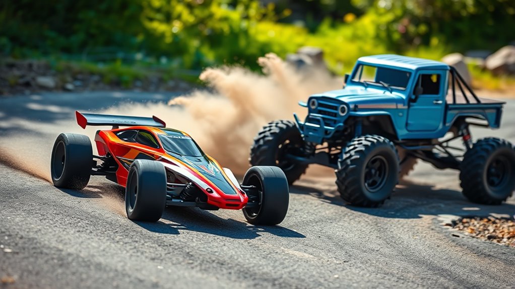 Choosing a remote control car or truck that matches your intended terrain is essential for peak performance and durability. First, verify that the vehicle is designed for the surfaces you plan to use, whether grass, sand, gravel, snow, or water. All-terrain tires with high grip and anti-skid features are fundamental to maintain stability across different surfaces. If you’ll be driving in wet conditions or water play, make sure the vehicle has waterproof or water-resistant electronics to prevent damage. A suitable suspension system is critical for handling uneven and rugged terrains, providing shock absorption and smooth control. Finally, check that the chassis and body are durable enough to withstand impacts and rough handling, especially for outdoor off-road adventures. Matching your RC car to your terrain guarantees a better experience and longer-lasting performance.