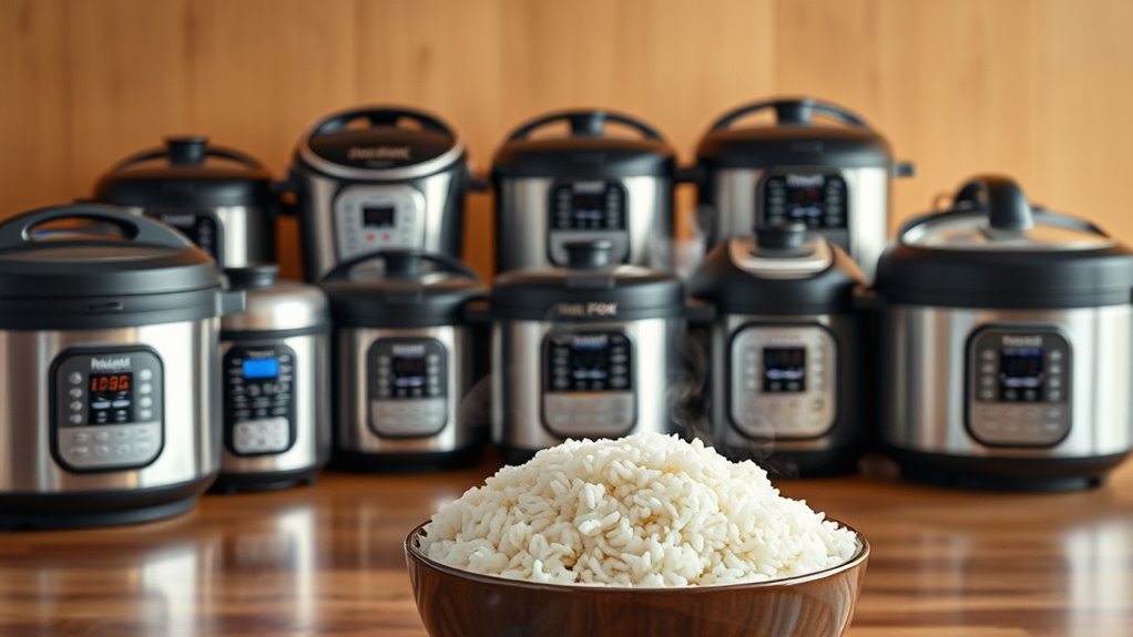 I’ve tested many rice cookers and found that models with fuzzy or Neuro Fuzzy logic, like the Zojirushi Neuro Fuzzy and various Aroma options, deliver consistently fluffy rice. They analyze moisture and rice type for precise cooking, plus feature multi-phase heating for even results. Compact, durable designs with easy controls make everyday use effortless. Keep exploring these top choices, and you’ll discover which one can make your perfect rice every time.