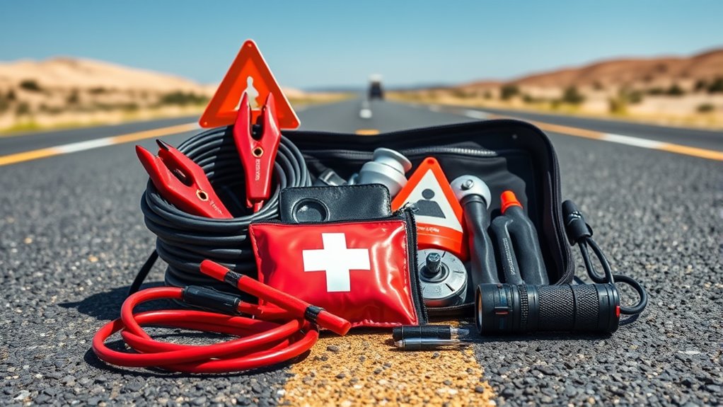 When choosing a roadside emergency kit with jumper cables, I consider the quality and durability of the tools to guarantee they last. Safety features are also vital to protect myself during emergencies, along with how easy the kit is to carry and store. Ultimately, I check if the kit matches my vehicle and includes extra supplies I might need in a pinch.