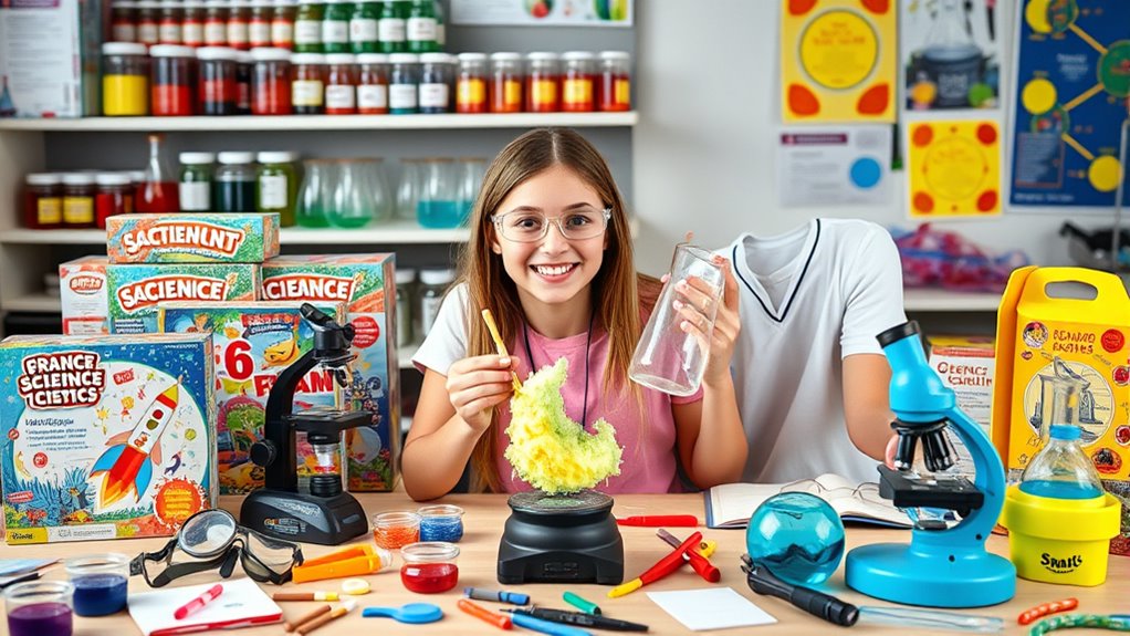 If you’re looking for the best science kits for teens that make learning both fun and exciting, I’ve found some fantastic options. From engineering kits like the Teach Tech Hydrobot Arm and Thames & Kosmos Cyborg Hand to chemistry sets from National Geographic, these kits promote hands-on exploration and STEM skills. They offer engaging experiments, safe tools, and interactive features that spark curiosity. Keep going to discover more about these inspiring kits and how they can boost your teen’s science journey.