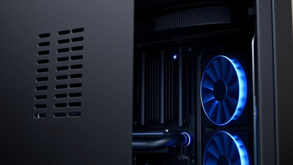 Have you ever wondered how silent PC cases manage to keep airflow efficient without generating extra noise? It’s all about strategic design. These cases use well-placed vents and filters that allow air to flow freely while cutting down on noise from turbulence and fan vibrations. Proper ventilation involves balancing intake and exhaust to prevent heat buildup without forcing fans to run louder. Mesh panels and multi-directional vents can boost cooling, but they need to be paired with noise-reducing features to stay silent. Ensuring good airflow pathways is vital; poor ventilation can cause overheating, making fans spin faster and louder. So, a well-designed airflow system keeps your build cool and quiet, without sacrificing performance or noise levels.