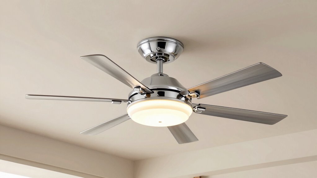 A quiet ceiling fan can make a big difference in creating a peaceful environment, especially in bedrooms or study areas. Generally, fans with a lower decibel rating—most operating below 30dB—are ideal for maintaining calm. Fans equipped with brushless DC motors tend to produce less noise than traditional AC motor models, enhancing comfort. Reversible fans that operate smoothly in both directions also tend to generate less vibration and sound. Additionally, blade design plays an essential role; factors like blade pitch and material significantly influence noise levels during operation. When selecting a fan, always check the noise level specifications in the product details. Prioritizing quiet operation guarantees your space remains tranquil, whether you’re sleeping, working, or relaxing.