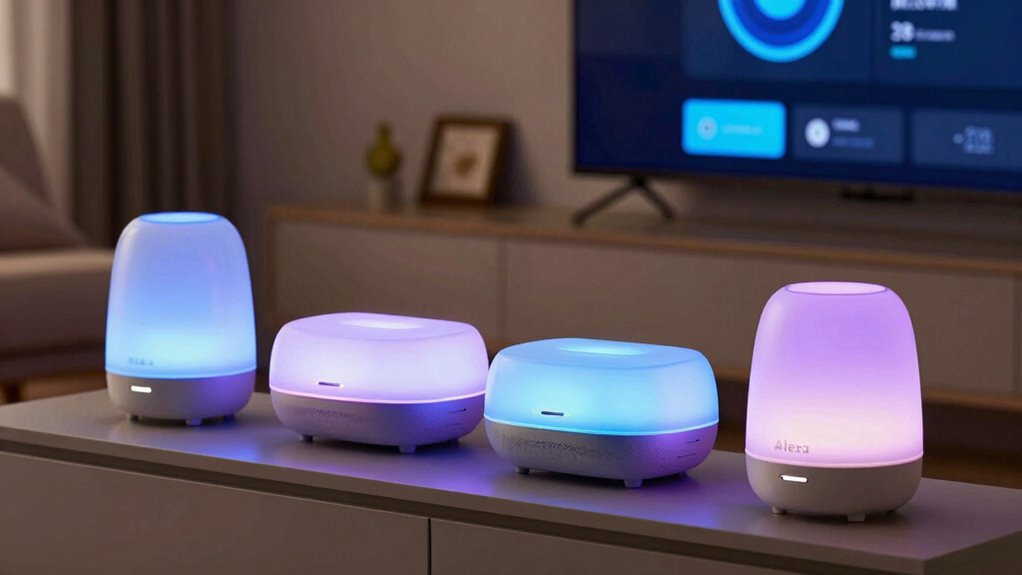 If you’re looking for the best smart diffusers compatible with Alexa in 2026, I recommend checking out options like the GoveeLife WiFi Humidifier, ASAKUKI WiFi Essential Oil Diffuser, and the Aera Mini. These devices offer app control, voice commands, customizable lighting, and long-lasting operation, perfect for creating a calming atmosphere. Staying informed about top choices guarantees you get the most out of your smart home setup—stick around to explore the full list and find your ideal diffuser.