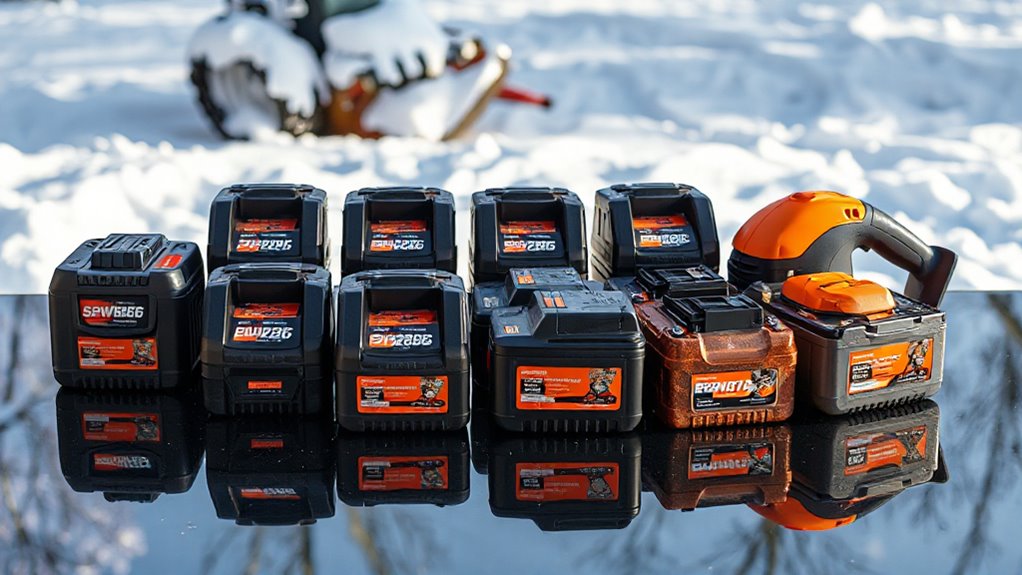 Proper storage and maintenance are essential to keeping your cordless snow blower battery in top shape. I recommend storing batteries in a cool, dry place between 40°F and 70°F to prevent capacity loss. Before long-term storage, make sure the battery is fully charged, and recharge it every 3-6 months to maintain performance. Avoid exposing batteries to extreme heat or freezing temperatures, as these can damage the chemistry and shorten their lifespan. When not in use, detach the battery from the snow blower to prevent accidental discharge and keep things organized. Regularly clean the contacts and terminals to prevent corrosion, ensuring that your battery delivers consistent power during snow removal. Proper care helps extend your battery’s life and keeps your snow blower ready when you need it most.