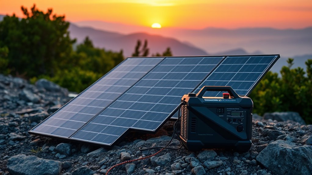 Since a higher conversion rate means more efficient energy transfer, it’s crucial to take this factor into account when selecting a solar panel kit for your portable generator. Panels with a 20-23% efficiency rate, like monocrystalline types, convert sunlight into usable electricity more effectively, speeding up the recharging process. This is especially important when sunlight is limited or shadows are present. Environmental factors such as temperature and shading can reduce a panel’s actual performance, so choosing panels with advanced MPPT technology helps maximize energy harvest by adjusting to changing conditions. Higher efficiency means less time waiting for your generator to recharge, making your portable power setup more reliable and effective during outdoor adventures. Prioritizing efficiency ensures you get the most out of your solar investment.