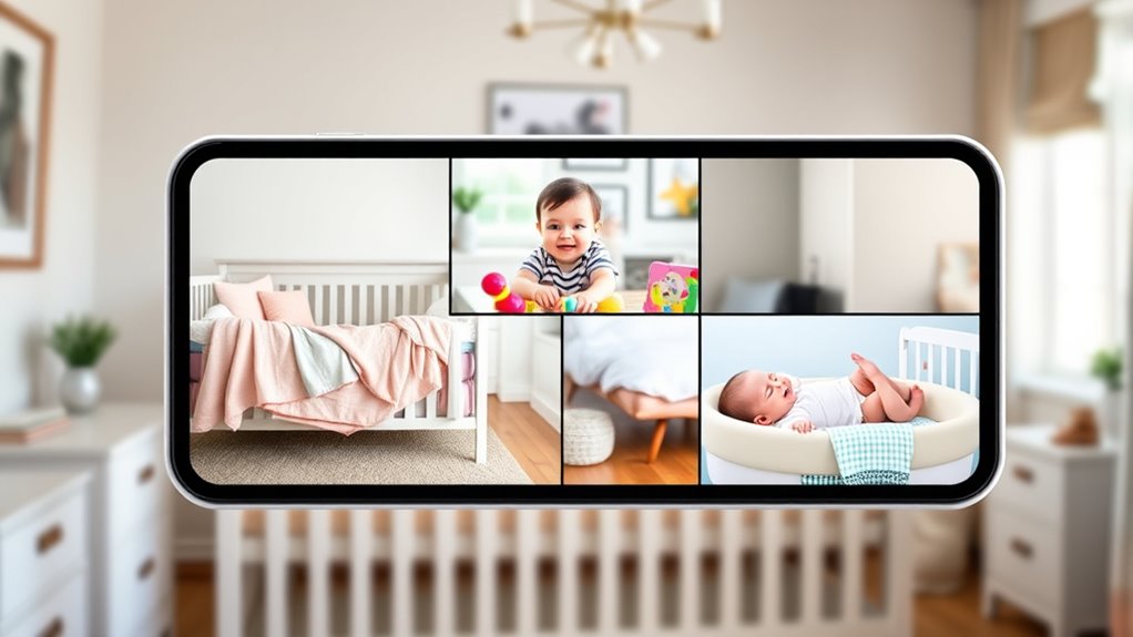 If you’re looking for the best split-screen video baby monitors, I recommend options like the HelloBaby with a 5-inch display, Blemil’s 6-inch model, or the iFamily 7-inch monitor with dual HD cameras. These monitors support multiple cameras, offer remote pan-tilt zoom, and have long battery life to cover different rooms or kids. Stay tuned—I’ll share detailed features and tips to help you choose the perfect setup for your family.