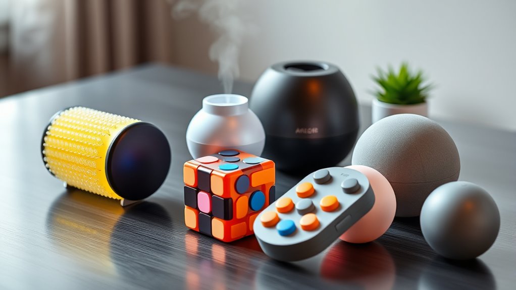Sensory features play a crucial role in how effective stress relief gadgets can be in calming the mind and body. Engaging multiple senses—touch, sight, and sound—can considerably enhance relaxation. I look for gadgets with varied textures like silicone or textured surfaces, which provide soothing tactile stimulation. Visual stimuli, such as spinning motions, color-changing lights, or optical illusions, help focus my mind and reduce stress. Auditory elements like gentle sounds or calming hums deepen the relaxation experience. Devices that combine these sensory features offer more complete engagement, making them more effective at calming nerves and alleviating anxiety. By selecting gadgets with multisensory elements, I can create a calming environment that targets my nervous system, helping me relax instantly and more effectively.