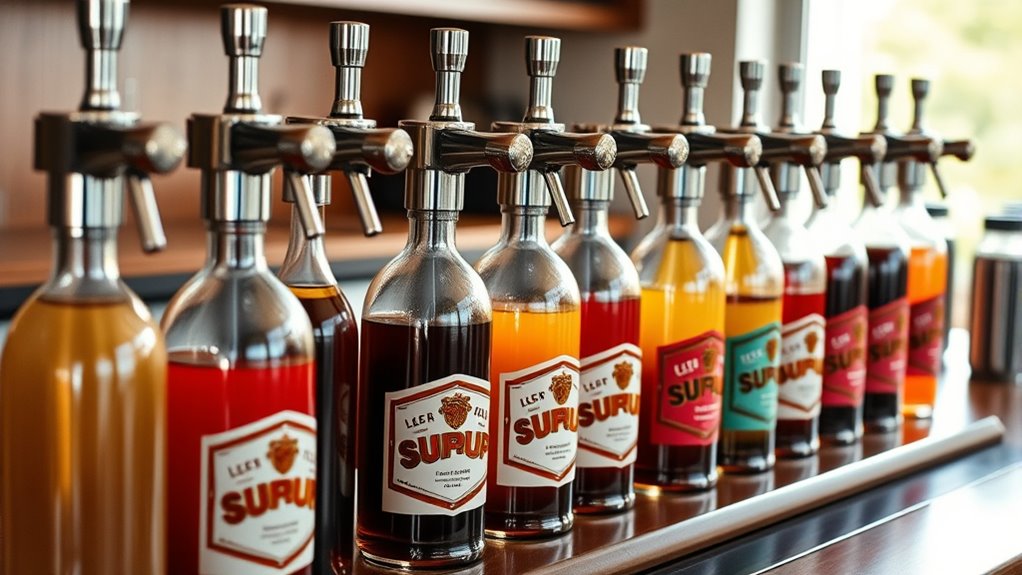 Accurate syrup dispensing plays a vital role in maintaining consistent flavor and presentation in your coffee bar. Precise pumps typically dispense between 2-10 mL per press, helping you control serving sizes and keep drinks uniform. Adjustable or customizable mechanisms allow you to fine-tune the amount each pump releases, ensuring accuracy tailored to your needs. Consistent pressure and well-designed pumps reduce variability, preventing over-pouring and waste. Regular cleaning and maintenance are essential, as they prevent clogging and keep dispensing accurate over time. Investing in pumps with reliable measurement capabilities means your staff can deliver consistent drinks every time, enhancing customer satisfaction. Ultimately, choosing syrups with high dispensing accuracy streamlines your operation and elevates your coffee bar’s quality.
