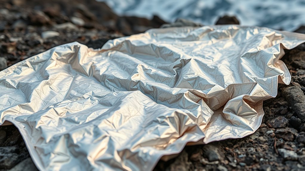 Beyond portability, considering how versatile a thermal emergency blanket is can greatly enhance its value in survival situations. These blankets aren’t just for warmth—they can serve as shelter, ground cover, rain poncho, or even a signal reflector. Their reflective surface not only retains heat but also helps with visibility during rescue. You can use them as windbreakers or sunshades, providing protection in various weather conditions. Their lightweight, compact design allows for easy repurposing across multiple outdoor tasks. Reusable and durable, these blankets withstand repeated use and rough handling, making them a cost-effective survival tool. Recognizing their multi-functionality guarantees you’re prepared for diverse scenarios, maximizing their utility in emergencies and boosting your chances of staying safe and comfortable until help arrives.