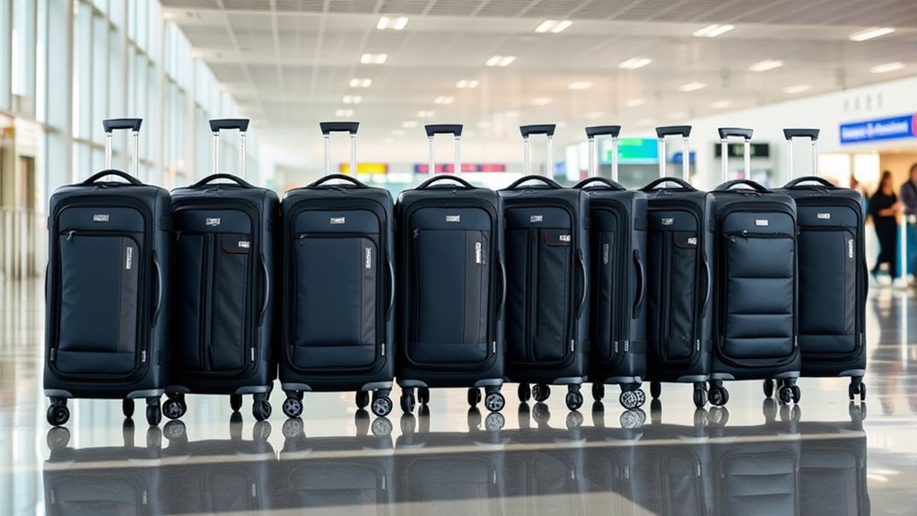 A 3-in-1 convertible duffle with wheels stands out as an ideal choice for travelers who need versatile, space-efficient luggage that adapts to various situations. I love how it combines a rolling base, detachable garment bag, and padded shoulder strap, making it perfect for airports, quick trips, or gym visits. It offers dedicated hanging pockets to keep clothes wrinkle-free and compartments for shoes and toiletries. Made from water-resistant polyester and equipped with lockable zippers, it’s both durable and secure. At just over 21 inches, it fits airline carry-on limits, helping me avoid checked baggage fees while staying organized and stylish on the go.