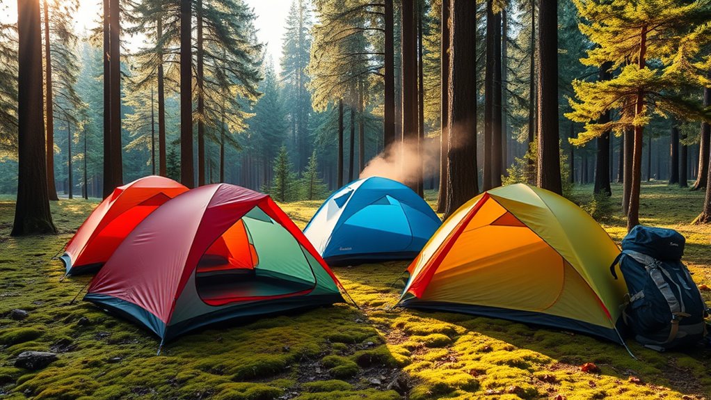 Effective ventilation is vital for staying comfortable in ultralight camping tents, especially during warm or humid weather. A good system usually includes mesh walls, large mesh panels, or multiple vents that promote airflow and help reduce condensation. Proper placement of roof or side vents enhances cross-ventilation, which is essential in humid conditions. Mesh doors and windows allow fresh air to enter while keeping insects out, maintaining comfort without sacrificing protection. Adjustable vents give you control over airflow, letting you adapt to changing weather. A well-designed ventilation system can considerably cut down on condensation buildup, keeping the interior dry and more comfortable. When choosing a tent, prioritize those with effective ventilation features to guarantee a more pleasant camping experience.
