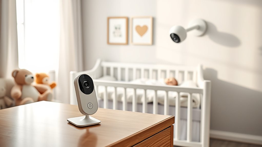 Effective night vision is vital for ensuring your baby’s safety and peace of mind during nighttime monitoring. Most monitors use infrared LEDs to deliver clear images in low-light or dark conditions. The quality and range of night vision depend on the number and quality of these LEDs; higher-end models provide more detailed black-and-white images. Many monitors automatically switch to night mode when ambient light drops, ensuring seamless visibility. Some advanced models offer color or low-glow IR technology, giving more natural visuals without disturbing your baby’s sleep. Additionally, the camera’s resolution and sensor sensitivity play a vital role in image sharpness during darkness. Evaluating these factors helps you choose a monitor that provides reliable, clear night vision for safe monitoring.
