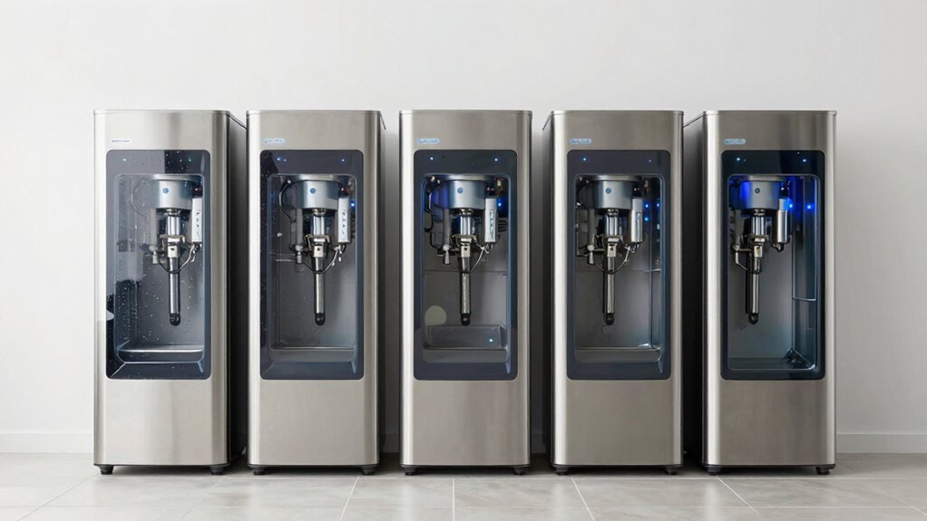 Understanding your water softener’s energy consumption helps guarantee you’re making an efficient choice. Salt-based ion exchange systems typically use electricity for control valves and regeneration, which can increase overall energy use. In contrast, salt-free descalers and scale prevention systems usually have lower energy requirements because they lack electrical components or regeneration cycles. The frequency of regeneration cycles, often powered by electricity, also affects energy consumption—more frequent regenerations mean higher energy use. Larger households might need high-capacity systems, which tend to run longer and consume more energy. Fortunately, many energy-efficient models feature programmable timers and sensors that optimize regeneration times, helping to reduce unnecessary power consumption. Considering these factors ensures you select a system that balances performance with energy efficiency.