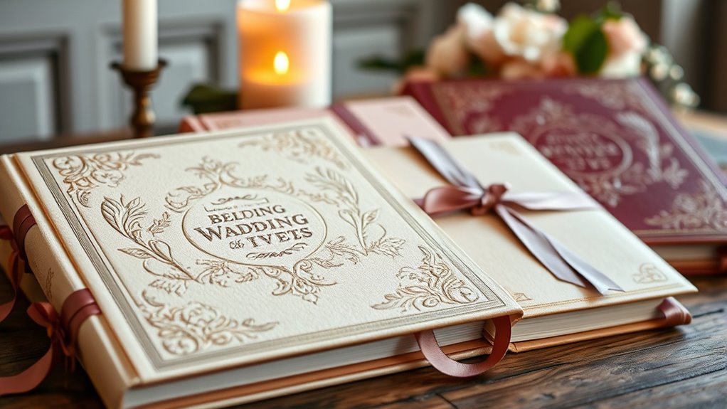 Vow books really enhance wedding photography sessions by giving us a beautiful, tangible element to capture. When you read your vows from a lovely book, it creates authentic, heartfelt moments that look stunning on camera. They also help you stay focused and relaxed, making your expressions more genuine. Plus, having a beautiful vow book as part of your photos adds a personal, timeless touch that you’ll cherish forever.