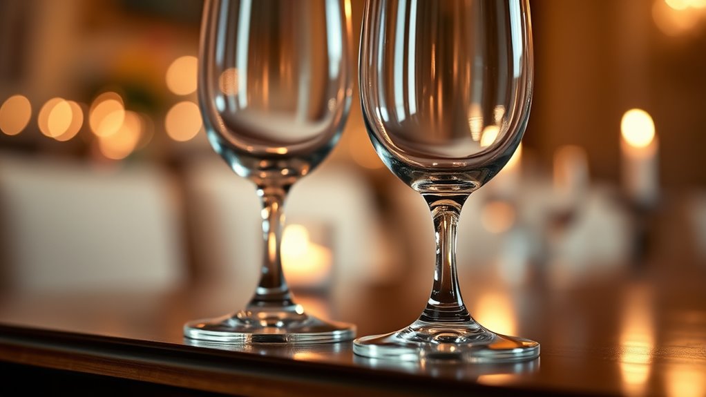 Choosing the right wine glass size and capacity is essential for enhancing your romantic evenings. Glass capacities typically range from 10 oz to 22 oz, affecting how much wine you pour. Larger glasses, above 20 oz, are perfect for red wines, allowing for better aeration that boosts flavor and aroma. Smaller glasses, around 10 oz, suit wine or cocktails and help you savor smaller, controlled pours. The size should match the type of beverage you’re serving to optimize taste and presentation. Consider whether you want glasses for everyday use or special occasions, as capacity impacts practicality and aesthetic appeal. Picking the right size ensures a more enjoyable experience, whether you’re indulging in a full-bodied red or a delicate sip of white or sparkling wine.